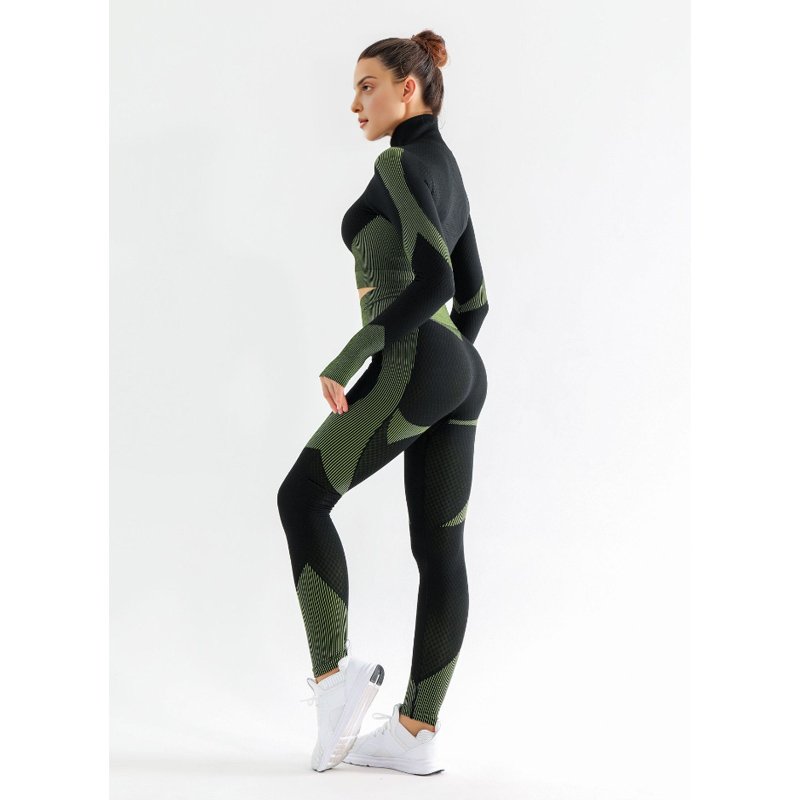 This jacket + leggings sets is seamless. The fabric is with good stretch and soft hand feel. The panels sewing by cover stitching. Side pockets can hold phone and some small articles. Size from S, M, L, XL.